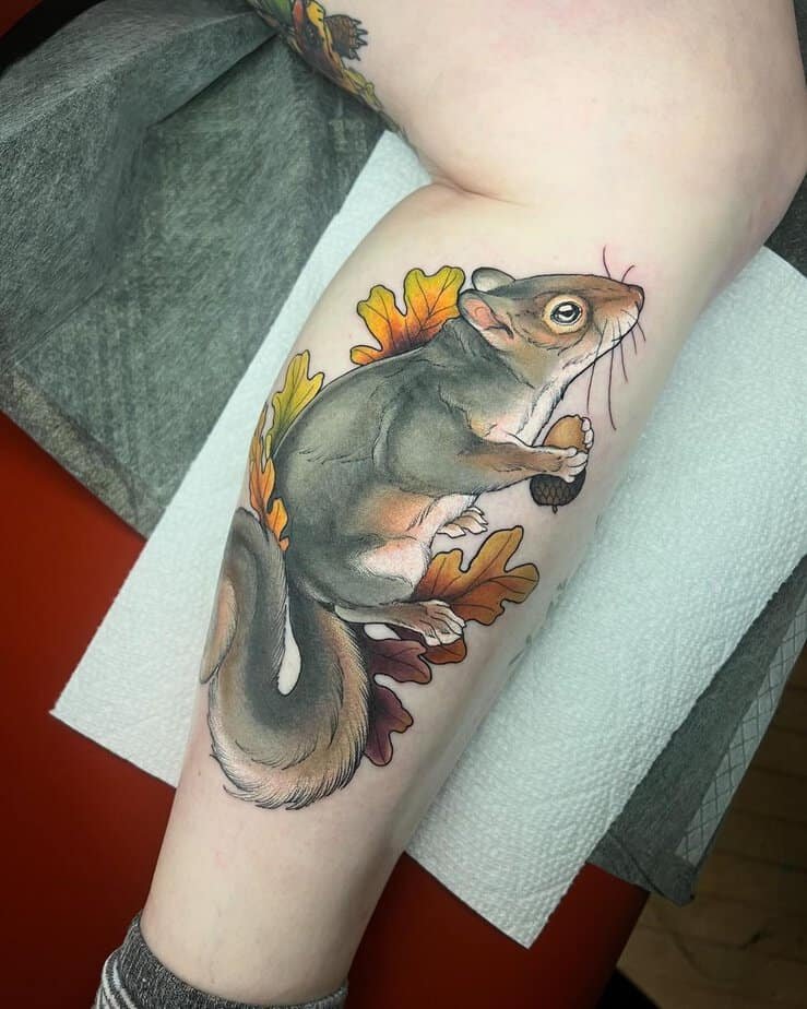 This one sits on the shin and screams autumn in the best way — warm, vibrant leaves and a squirrel clutching a nut like it’s the most precious thing in the world. It reads tender and cozy, like a tiny nature scene you get to carry around, and honestly it makes me want to go collect leaves and hot cider.