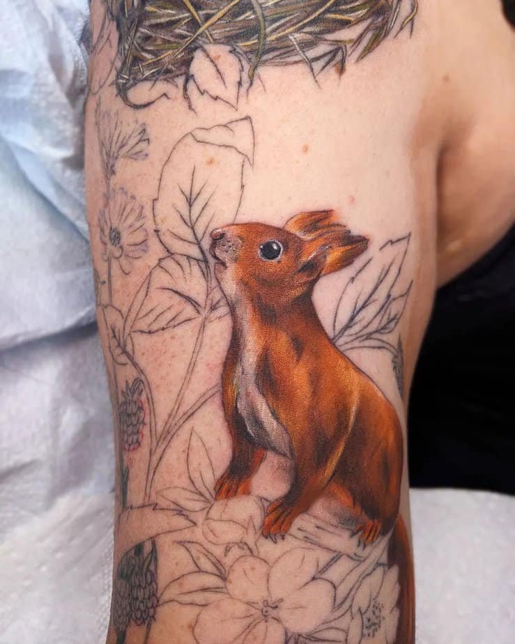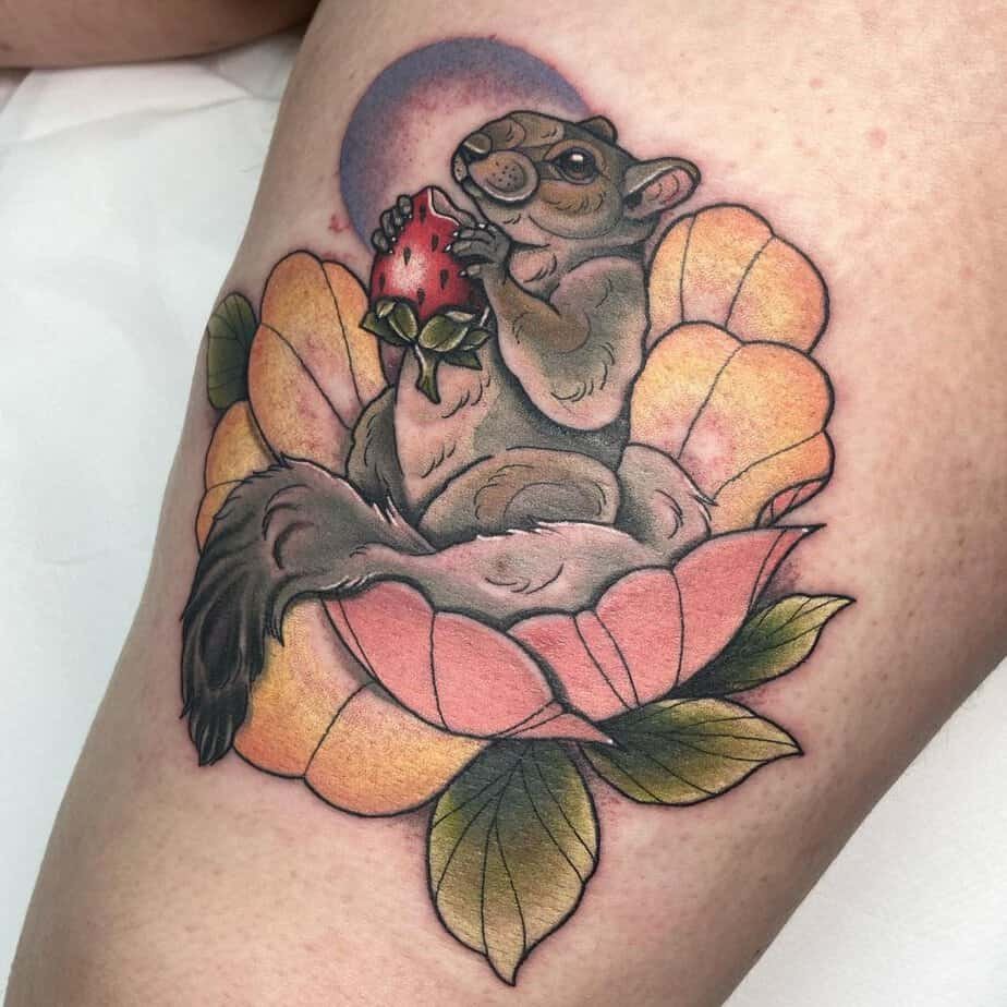 This forearm tattoo literally looks like a little offering: a squirrel holding a flower, sweet and a bit bashful. It’s colorful and upbeat, perfect if you want something that immediately brightens a room (or at least your sleeve).