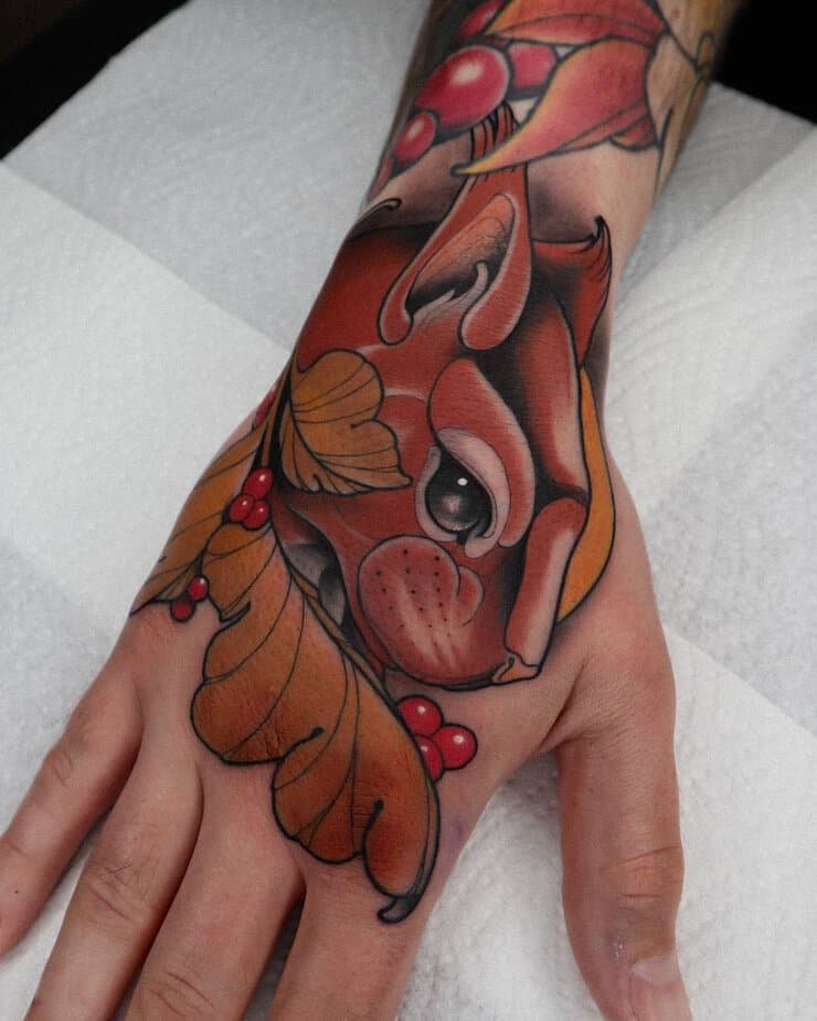 This one stretches from forearm to hand and is meant to be noticed. Intricate details, bold placement — it’s the kind of piece that gets compliments and questions. If you want attention, this is your squirrel.