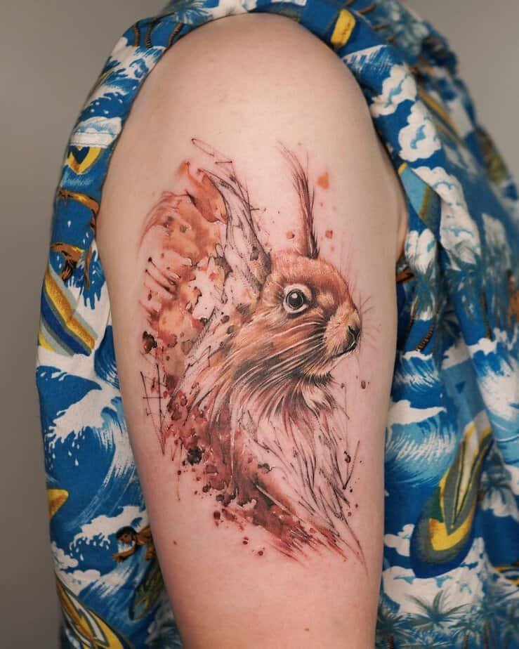 Watercolor tattoos just have this painterly vibe, and this squirrel rendered in warm browns feels like a tiny artwork. It’s pretty and symbolic — soft, but with presence.