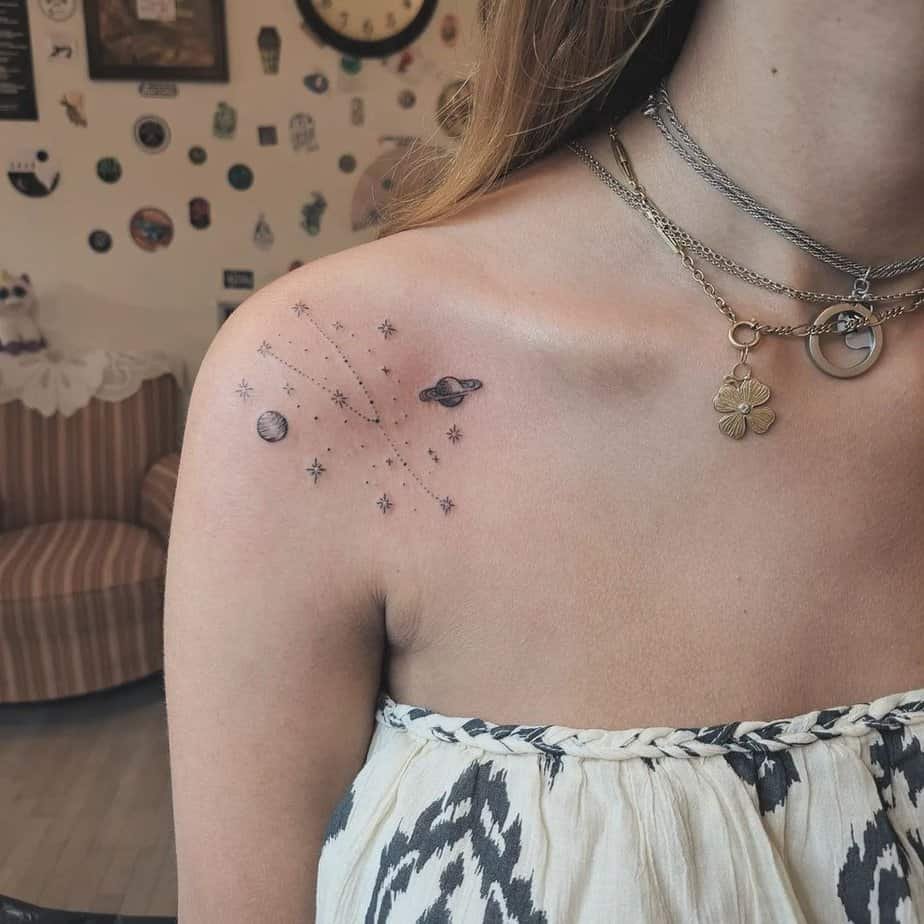 Subtle and meaningful, this shoulder piece uses small dots to map the constellation and sprinkles in planets and stars. It’s a quiet nod to both earthiness and the cosmos — very poetic in its simplicity.