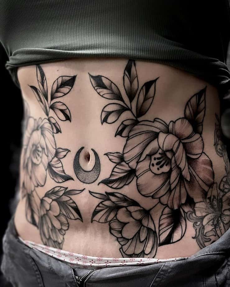 Want to go all-out? A floral spread across the stomach with a little moon nestled near the belly button is romantic and a little mystical — a full statement piece.