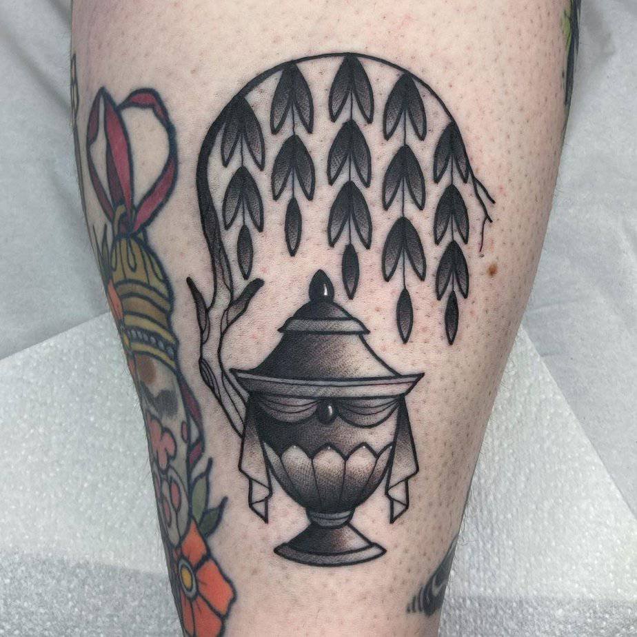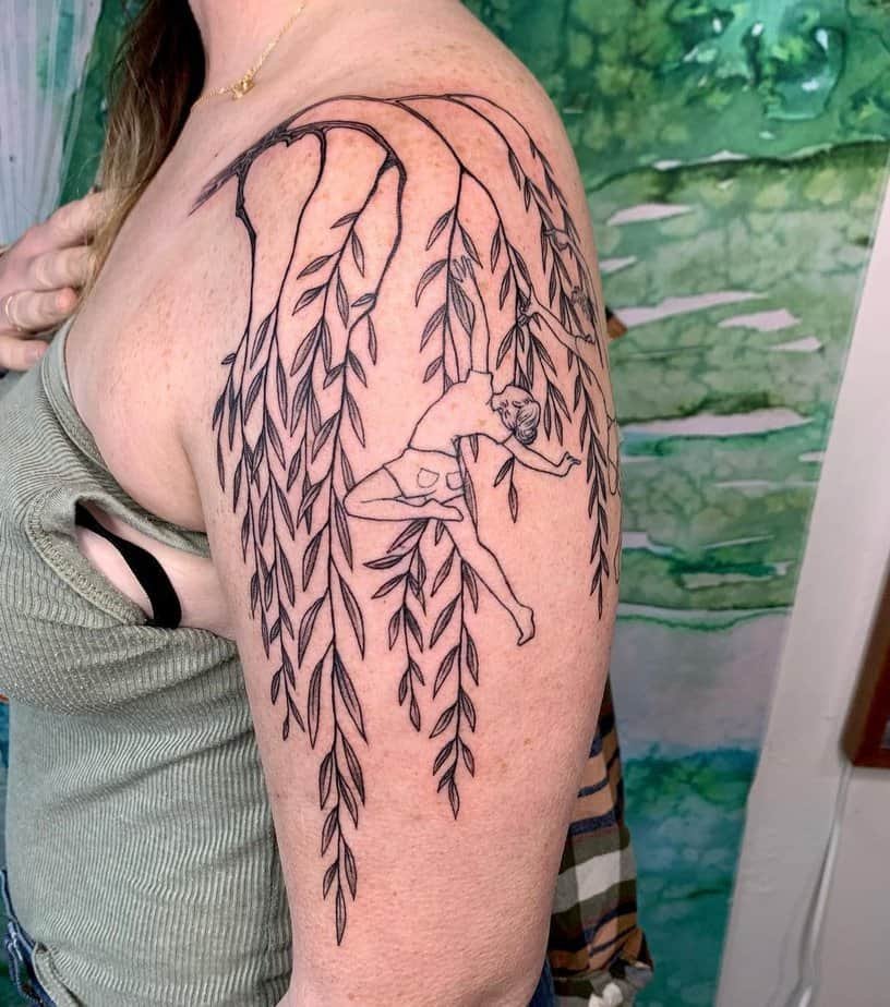 This mixes movement and nature, with a dancer swinging through the willow branches. It’s playful and graceful, like the tree is part of the performance. If you love tattoos that tell a little story and feel kinetic, this one’s for you.