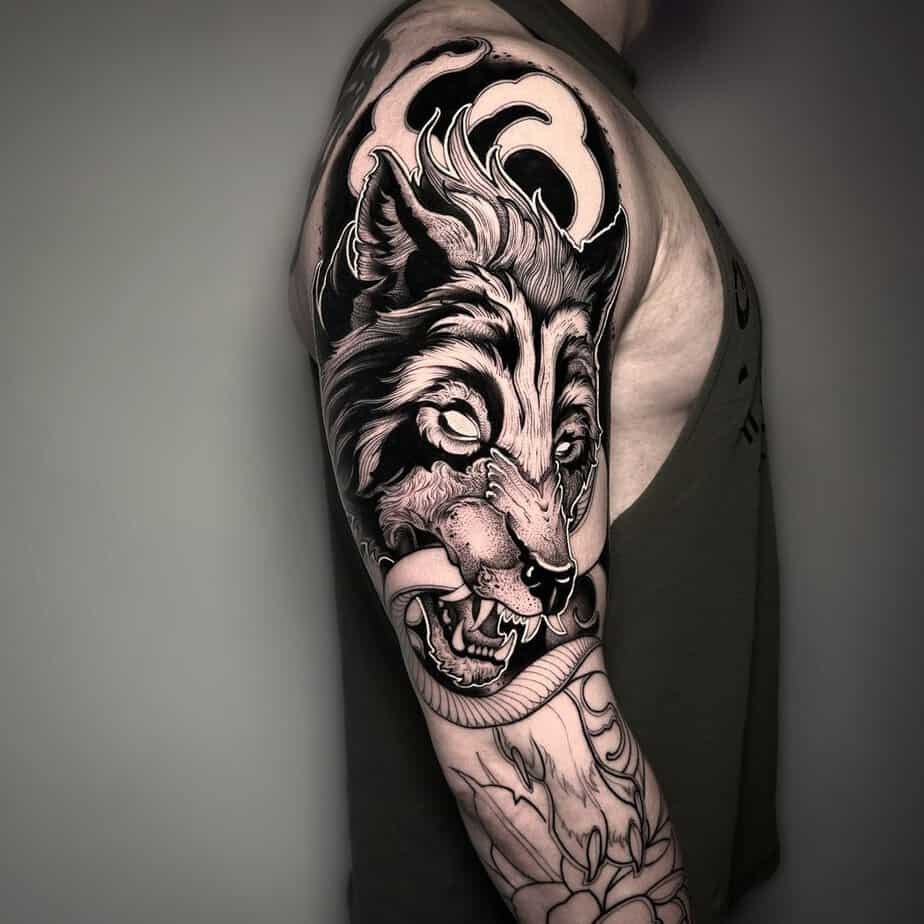 Bright colors, a full moon, and a wolf in full cry — this one’s vibrant and playful. If you want your body art to pop, this is the kind of piece that makes people stop and smile.