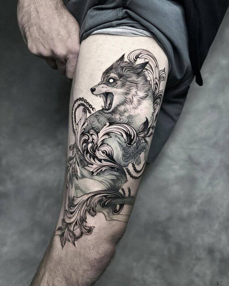 Swirling patterns weave around a wolf, giving motion and grace to its fierceness. For lovers of detail and elegance, this is a real showstopper.