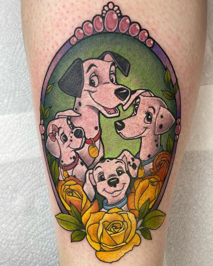 Nostalgia meets floral charm: a little framed 101 Dalmatians family and a sweet yellow rose to finish the scene. It’s playful, cute, and perfect if you want a tattoo that feels like a storybook moment and makes you grin every time you see it.