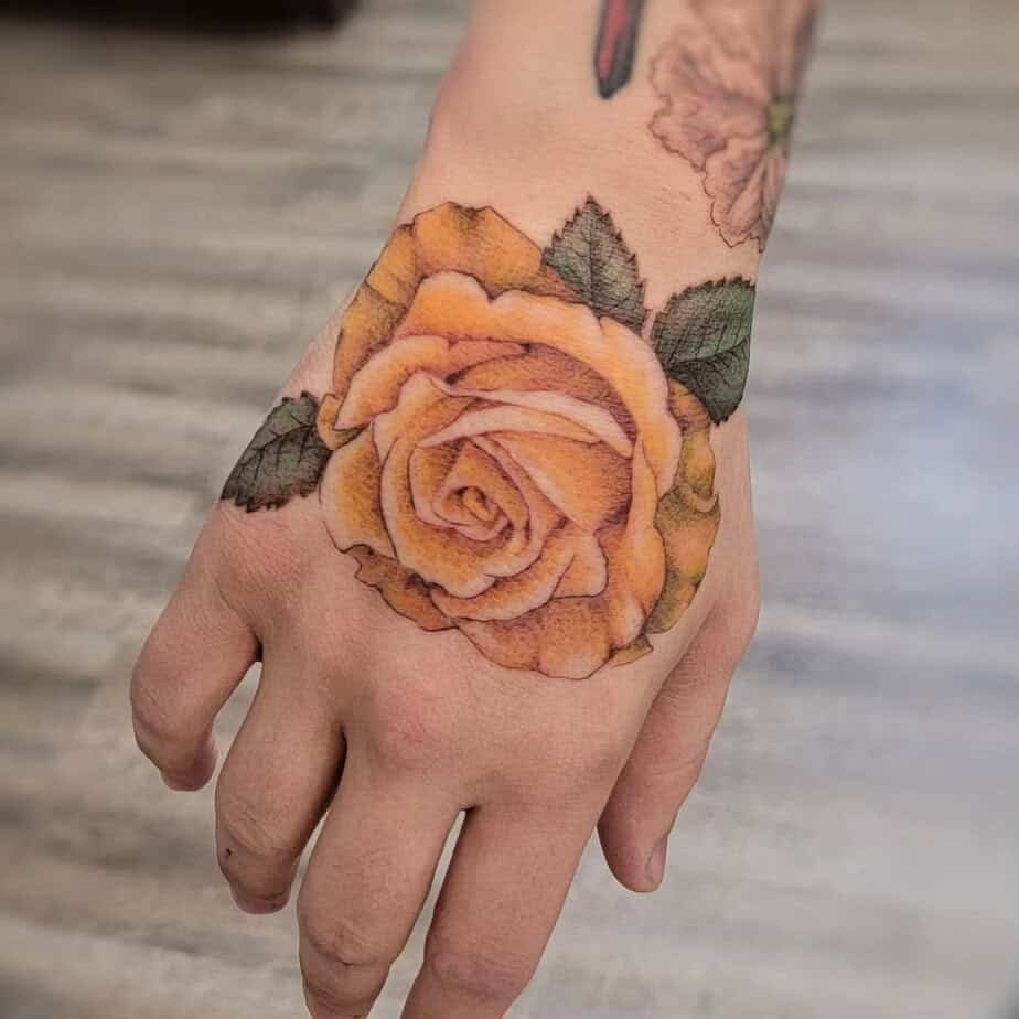 Big bloom, right on the hand — this one doesn’t hide. The design is intricate and showy, and because yellow roses often stand for joy and optimism, it’s like wearing hope on your skin. Hand tattoos are brave and very now; if you want something that announces itself, this fits the bill.