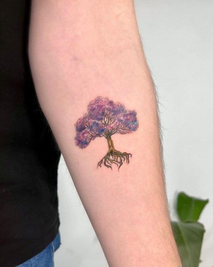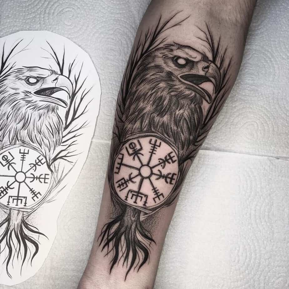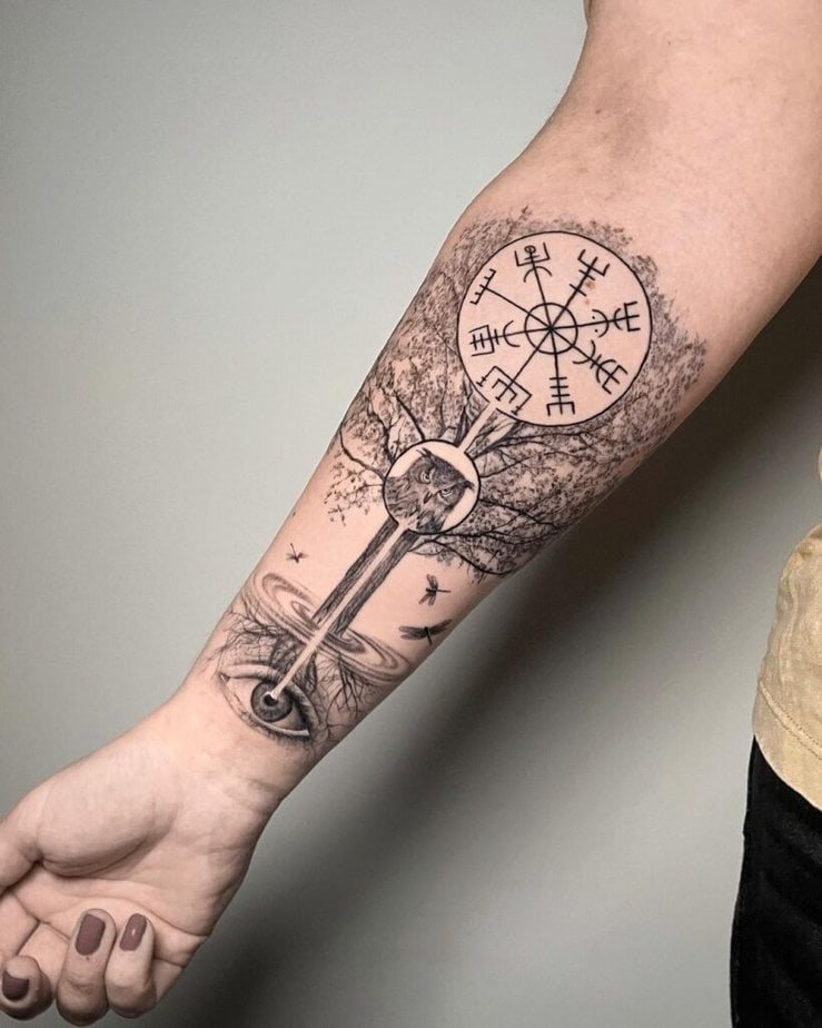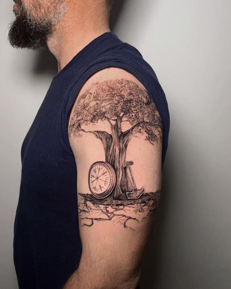 This one’s got the works: a compass, the tree, and extras that all come together to make a single scene on your arm. It’s the kind of tattoo people stop to look at when you’re mid-conversation.