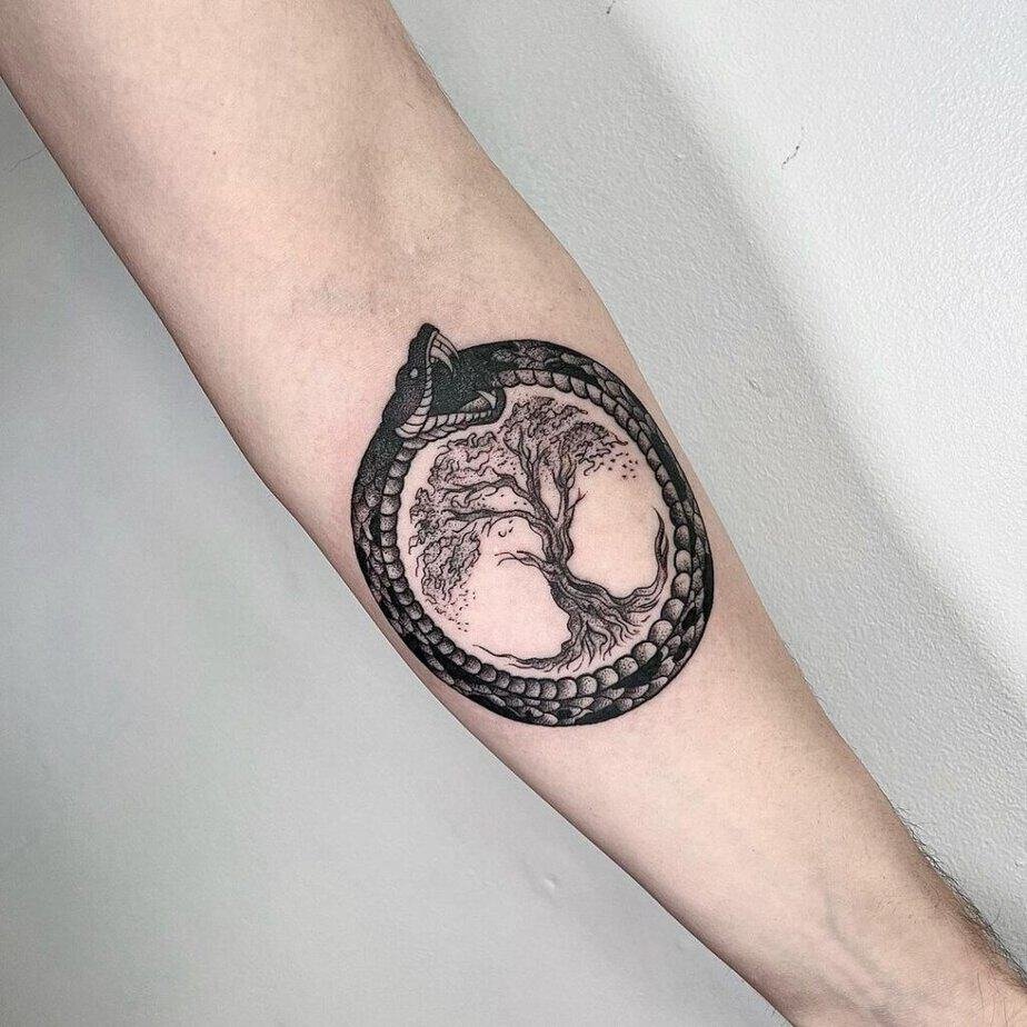 Inside-arm Yggdrasil with an Ouroboros — circle of life energy