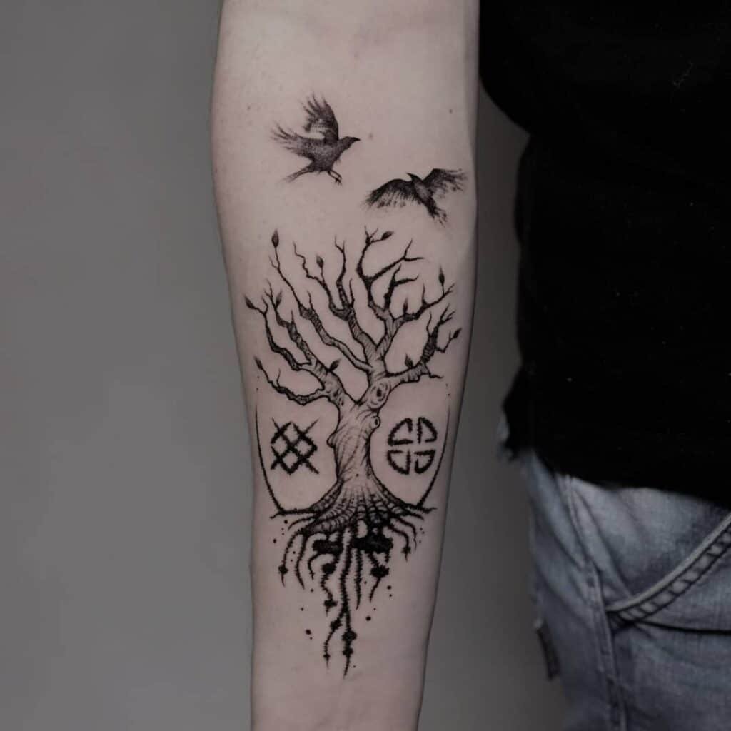 Another inside-arm detailed Yggdrasil — layered symbols, layered meaning