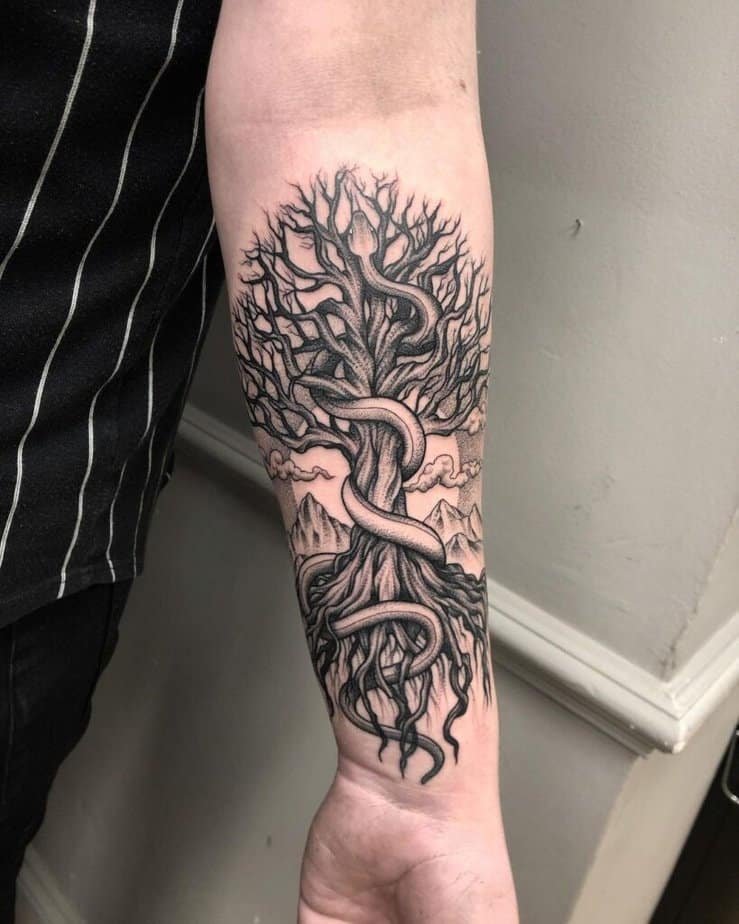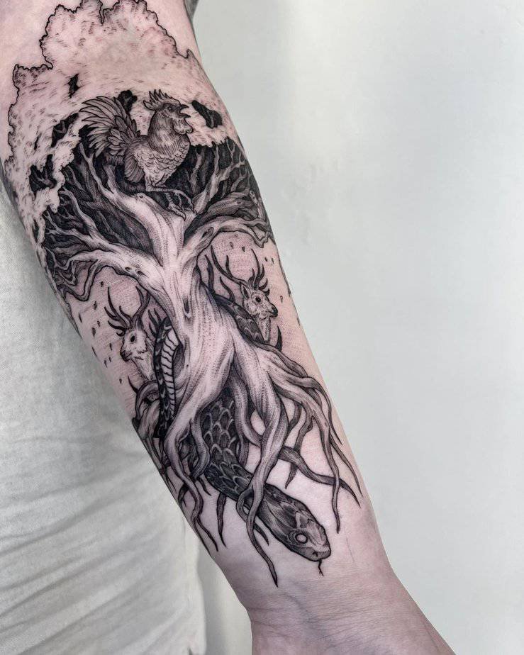 Forearm Yggdrasil with a serpent wrapped around it — dramatic and classic