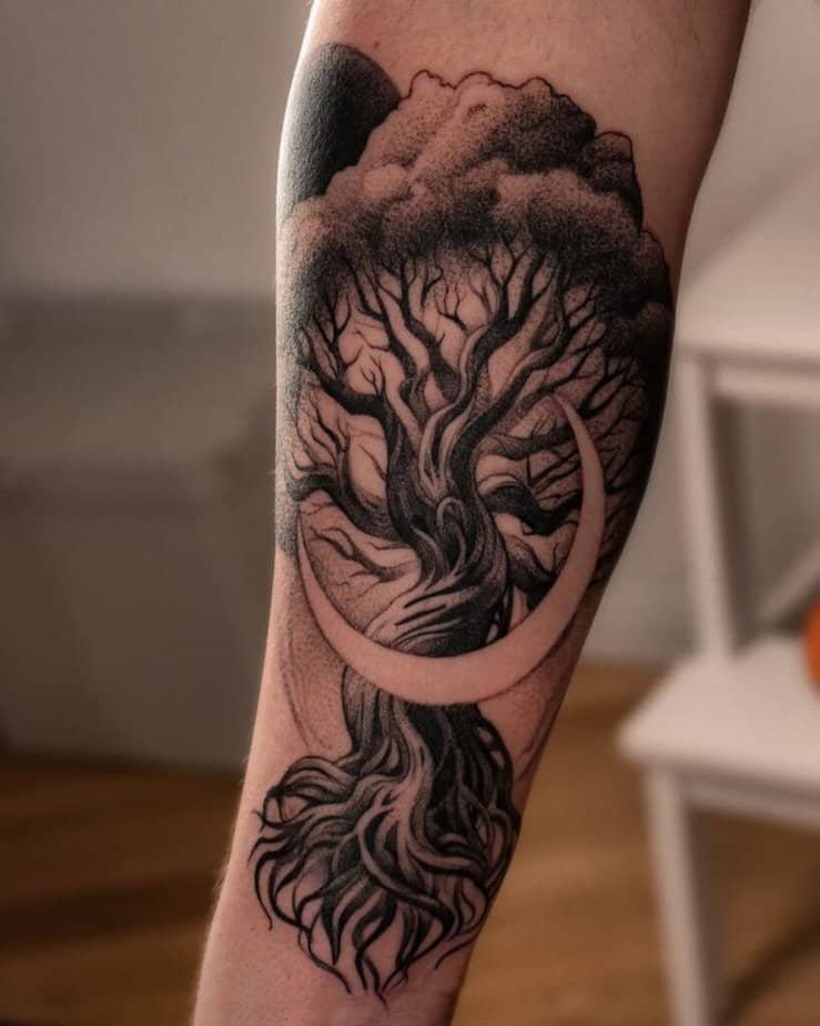Blackwork uses saturated black to create bold contrast and presence. If you want the tree to feel like a silhouette of something ancient and unstoppable, go blackwork.