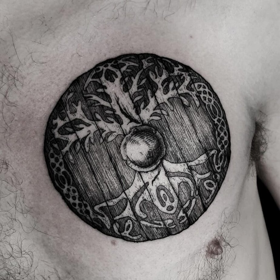 Chest pieces are intimate — mostly hidden until you decide to reveal them. A wooden shield design with Yggdrasil feels like wearing your heritage and your resilience right over your heart.