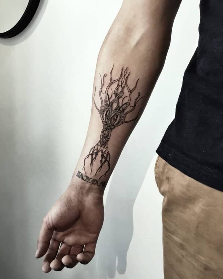 Detailed tattoos can be a long session, but they age beautifully and tell so much more of a story. This kind of inside-arm Yggdrasil can include runes, compasses, or personal symbols — basically whatever says “you” in Norse.