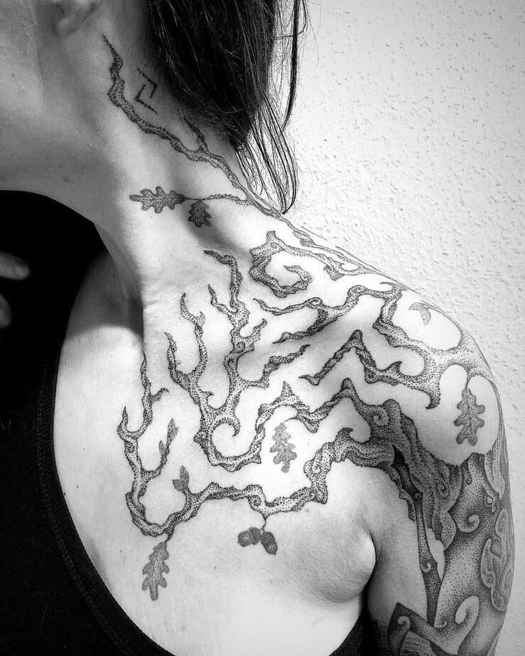 Dotwork shoulder Yggdrasil — soft, meditative, and nuanced